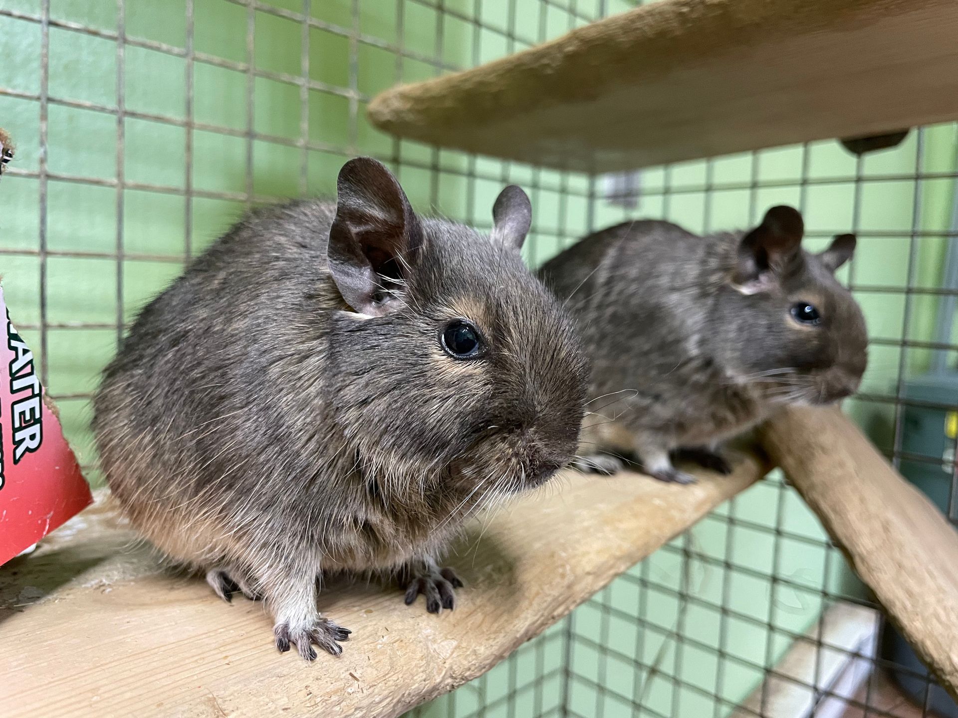 Degus are highly social. Together, groups will construct large underground burrows with different sections for different activities. Litters contain about 6 pups each.